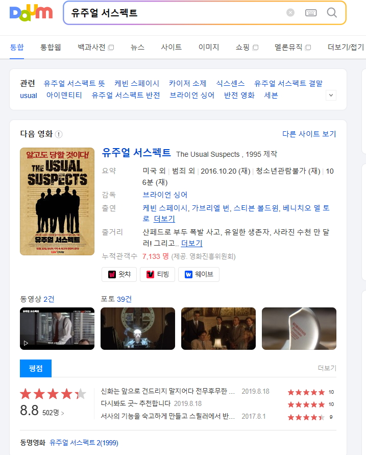 유주얼 서스펙트는 스토리텔링의 예술과 관객을 사로잡고 호기심을 자극하며 도전하는 영화의 힘에 대한 증거입니다. 세심하게 구성된 줄거리, 뛰어난 공연, 지속적인 임팩트가 역대 최고의 미스터리 스릴러 중 하나로 자리 잡았습니다. 영화의 노련한 팬이든, 영화 같은 보석을 찾는 신참이든, 유주얼 서스펙트는 마지막 순간까지, 그리고 그 이후까지 계속 추측하게 될 필수 시청입니다.
